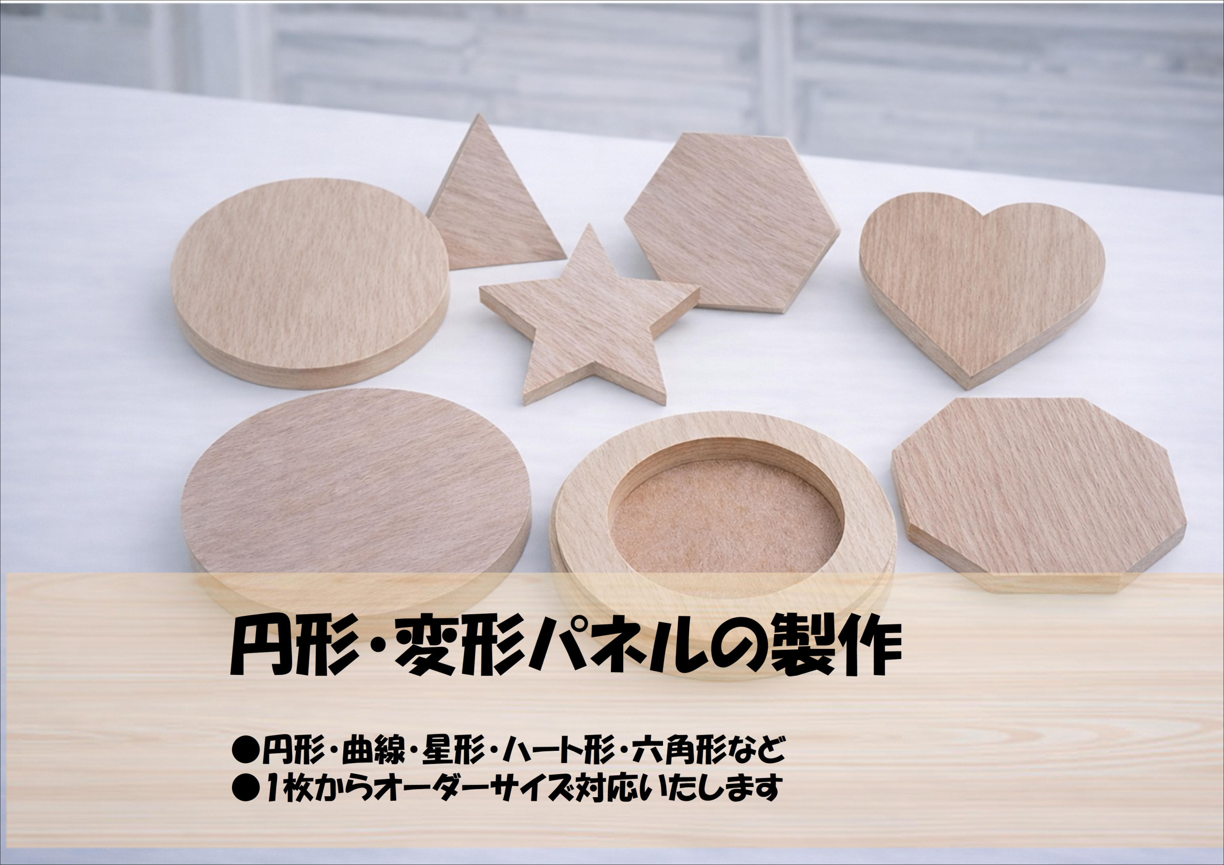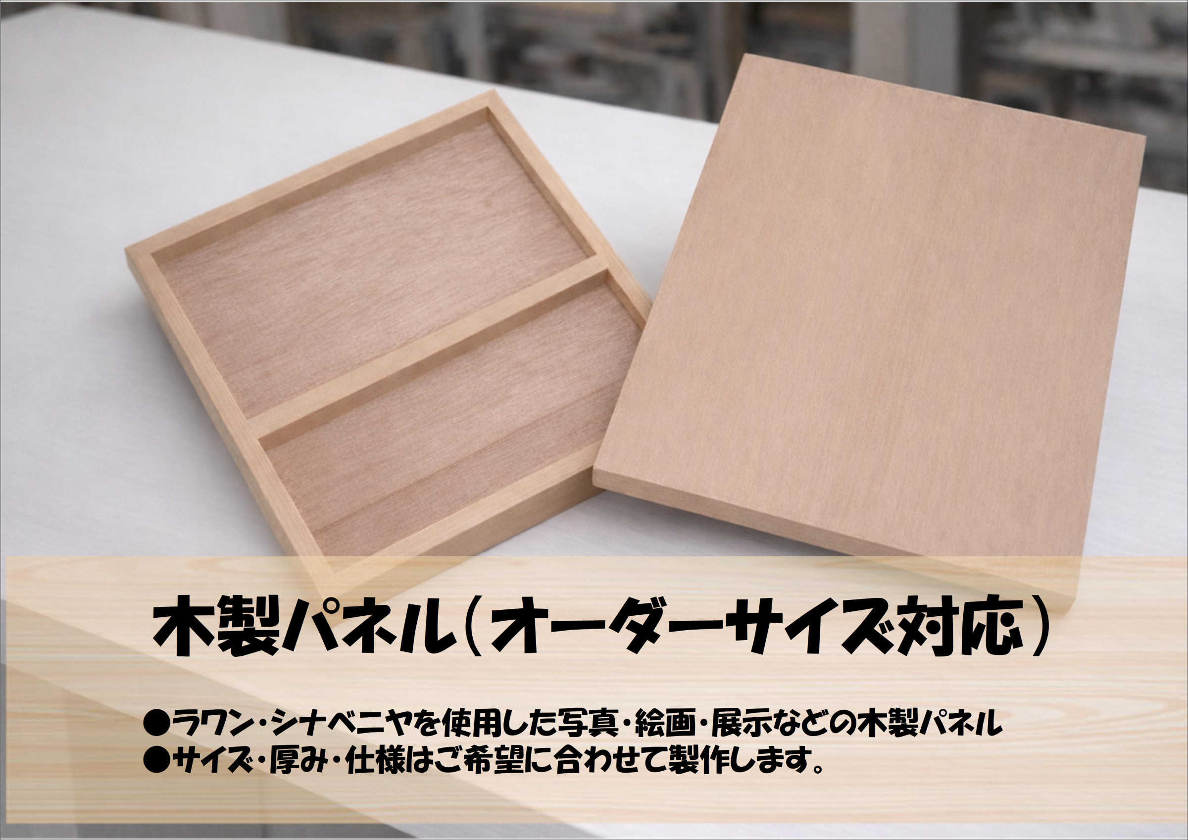 木製パネル、額縁、展示用部材、住宅用建具や家具まで、 木製品であればジャンルを問わずオーダー製作を行っています。
